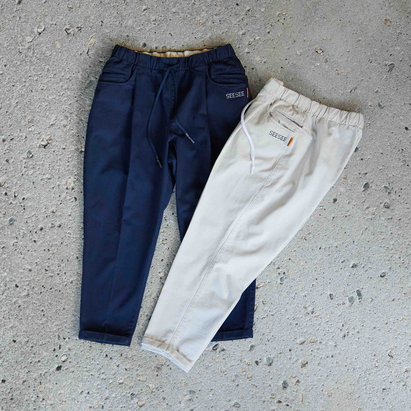 チノパンの新しい解釈として洗いざらしのコットン素材にセンタープレス、 裾を細身幅のダブル仕上げ、ウエスト部分はイージーパンツ仕様。 子供っぽくならないように全体のシルエットはやや細身のテーパードシルエットとなっています。
