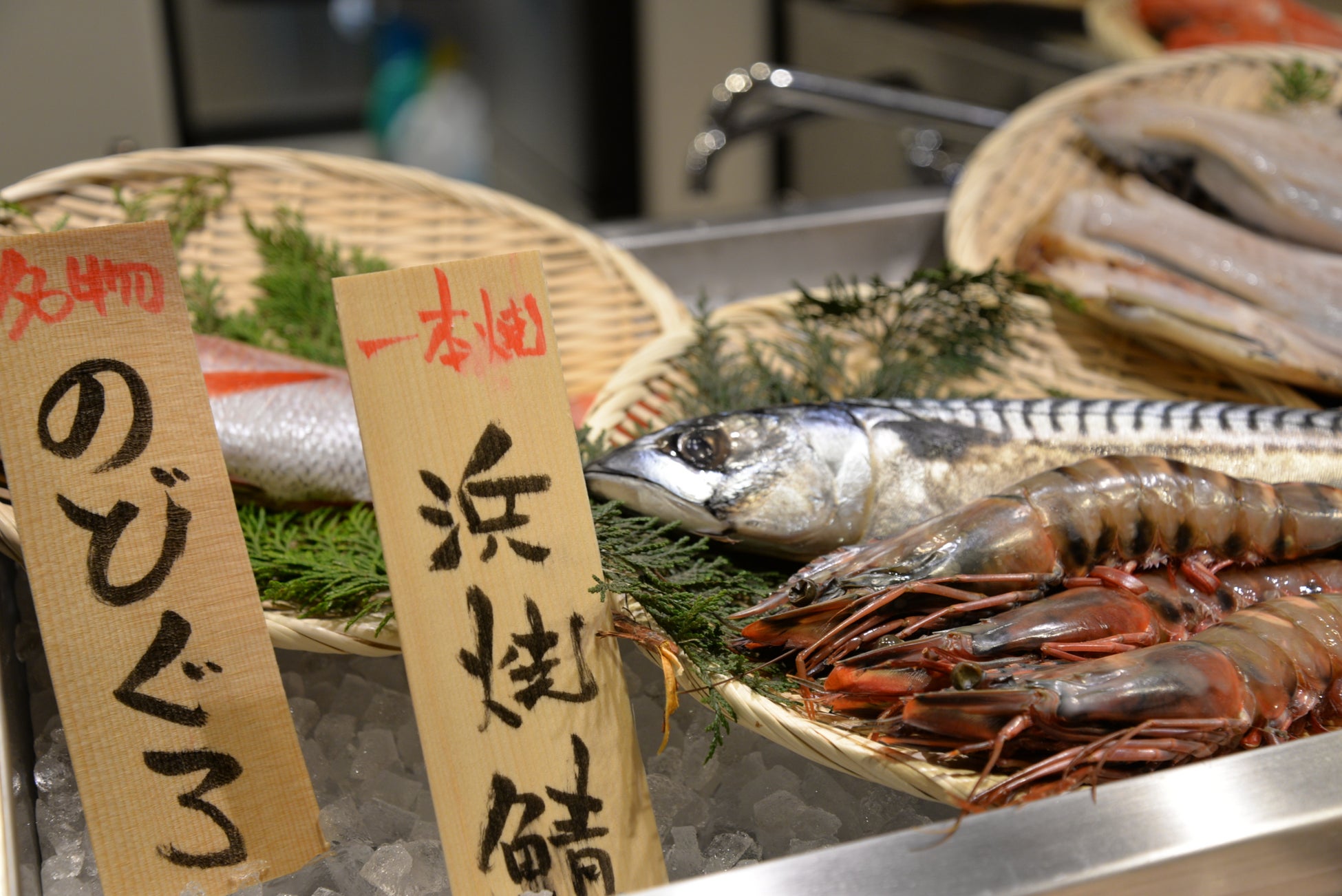 旬の鮮魚をワゴンでおすすめ。魚の種類によって美味しい食べ方(刺身・焼き・煮る)をご提案いたします。