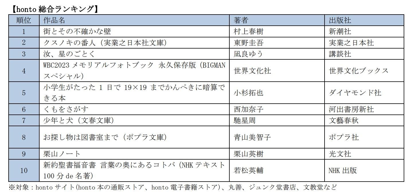 新年度となる4月は、honto総合ランキングに注目です。1位は『街とその不確かな壁』が獲得しました。本作は村上春樹さんの6年ぶりとなる待望の新作長編1,200枚ということもあり、大きな話題を集めています。また、総合ランキングだけではなく、文芸ランキング・男女別ランキング・20代・30代・40代ランキングでもそれぞれ1位を獲得しており、幅広い層からの人気の高さがうかがえます。2位にランクインしたのは『クスノキの番人(実業之日本社文庫)』。こちらは東野圭吾さんの国内50万部超のベストセラーが文庫化となり、多くの人が手に取りやすくなりました。4位には第5回ワールド・ベースボール・クラシック(WBC)の激闘の軌跡を完全網羅した『WBC2023メモリアルフォトブック 永久保存版(BIGMANスペシャル)』が登場。侍ジャパンが悲願の14年振り、3度目の頂点に輝き見事世界一を奪還した感動が蘇ります。