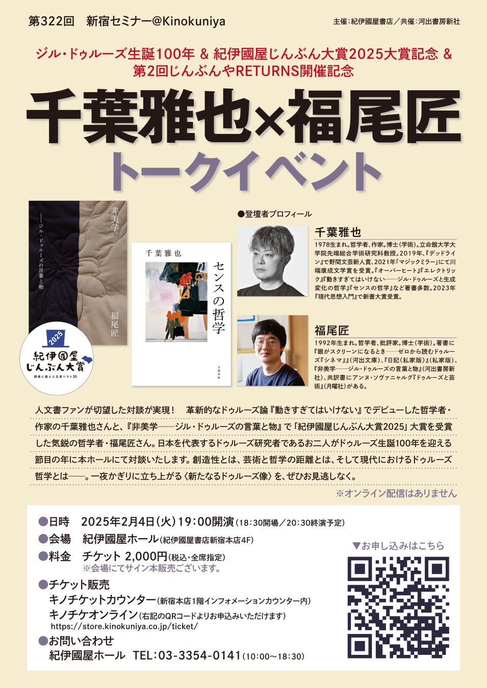 ジル・ドゥルーズ生誕100年 & 紀伊國屋じんぶん大賞2025大賞記念 、また、紀伊國屋書店新宿本店での選書フェア「第2回じんぶんやRETURNS」の開催を記念したトークイベントが決定。