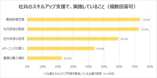 7割以上の企業が「社員のスキルアップ支援」を実施。「資格取得支援を拡充し、社員の学び直しの意欲を高めている」「スキル習得支援を通して、生産性を高めたい」の声