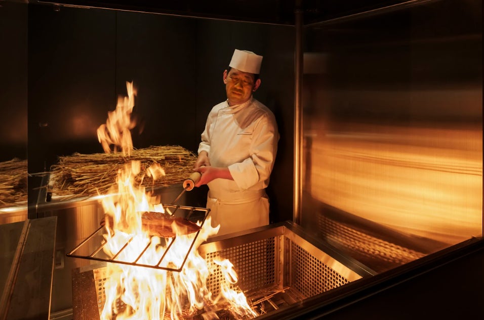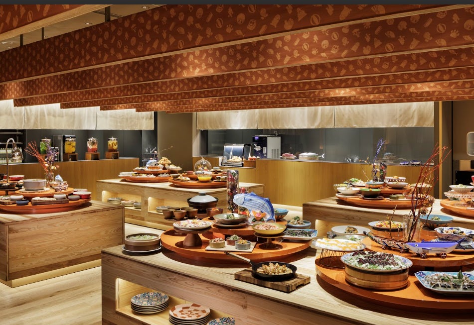 「TOSAインスパイア」をコンセプトに、高知の郷土料理と調理法を取り入れたビュッフェスタイルの食事。夕食には、目の前で仕上げる藁焼きカツオのたたきや芋けんぴ。朝食では、ゆずが香る甘酸っぱいフレンチトーストや、日曜市名物「いも天」を作り立てで用意します。数々の料理が並ぶビュッフェテーブルは皿鉢に見立てており、好みのものを好きなだけ選び取って「マイ皿鉢」を作る楽しみを演出しました。料理にも空間設計にもこだわりを詰め込み、高知の食魅力を存分に堪能できるダイニングが完成しました。
