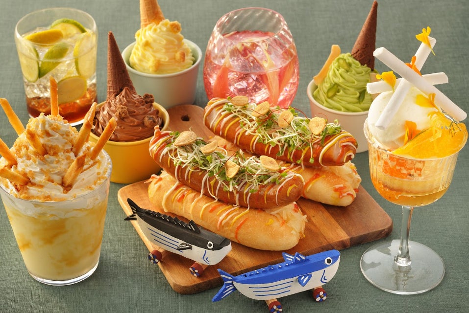 手頃なスナックから満足感のあるメニューまで取り揃えています。お勧めは、カツオを混ぜ込んだソーセージを乗せた「カツオドッグ」や、みょうがを丸ごと使った「みょうがネード」など、高知に馴染みある食材をアレンジしたオリジナルメニューです。こちらは、店内だけでなく同フロアにある大階段やラウンジなど、館内のどちらでも楽しめます。