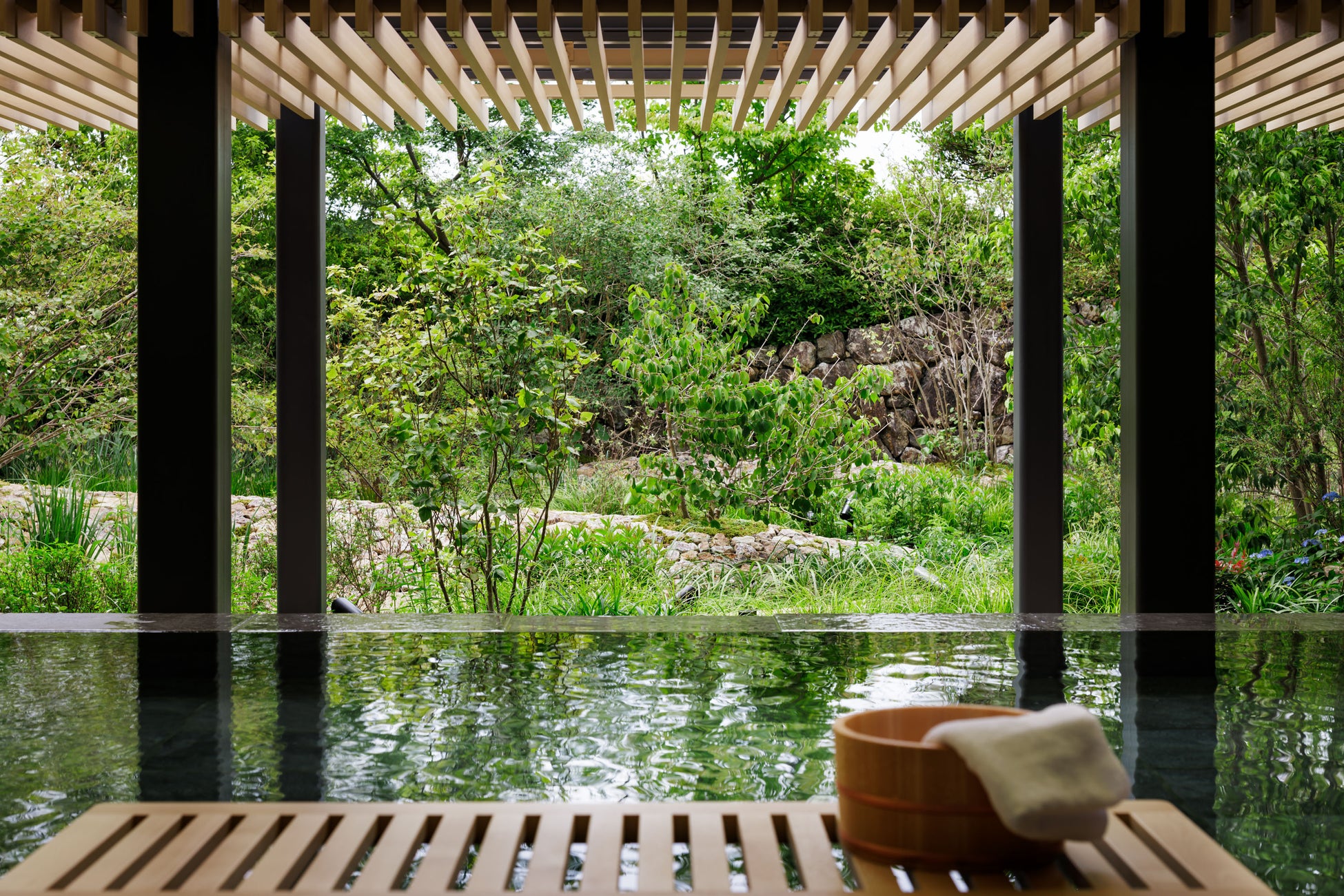 番台をイメージした入口で、木彫りの土佐犬がお客様をお迎えする大浴場。内湯、露天風呂、サウナがあり、旅の疲れを癒せます。特徴は露天風呂の前に広がる庭園です。生薬として暮らしのなかで親しまれてきた薬用植物をはじめとして、豊かな土佐の自然を取り入れています。トサミズキ・トサシモツケ・トサノミツバツツジといった代表的な山野草もあり、四季折々の美しい風景を1年中楽しめるこだわりの景観を造りました。内湯には高知の工芸品「フラフ」を模した見ごたえのあるタイル壁画が広がります。さらにオートロウリュのサウナも完備しています。湯上がり処では柑橘と生姜を使った冷たいドリンクを楽しむことができ、最後まで高知の魅力を体感しながら過ごせる大浴場です。