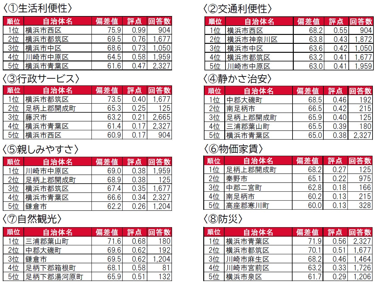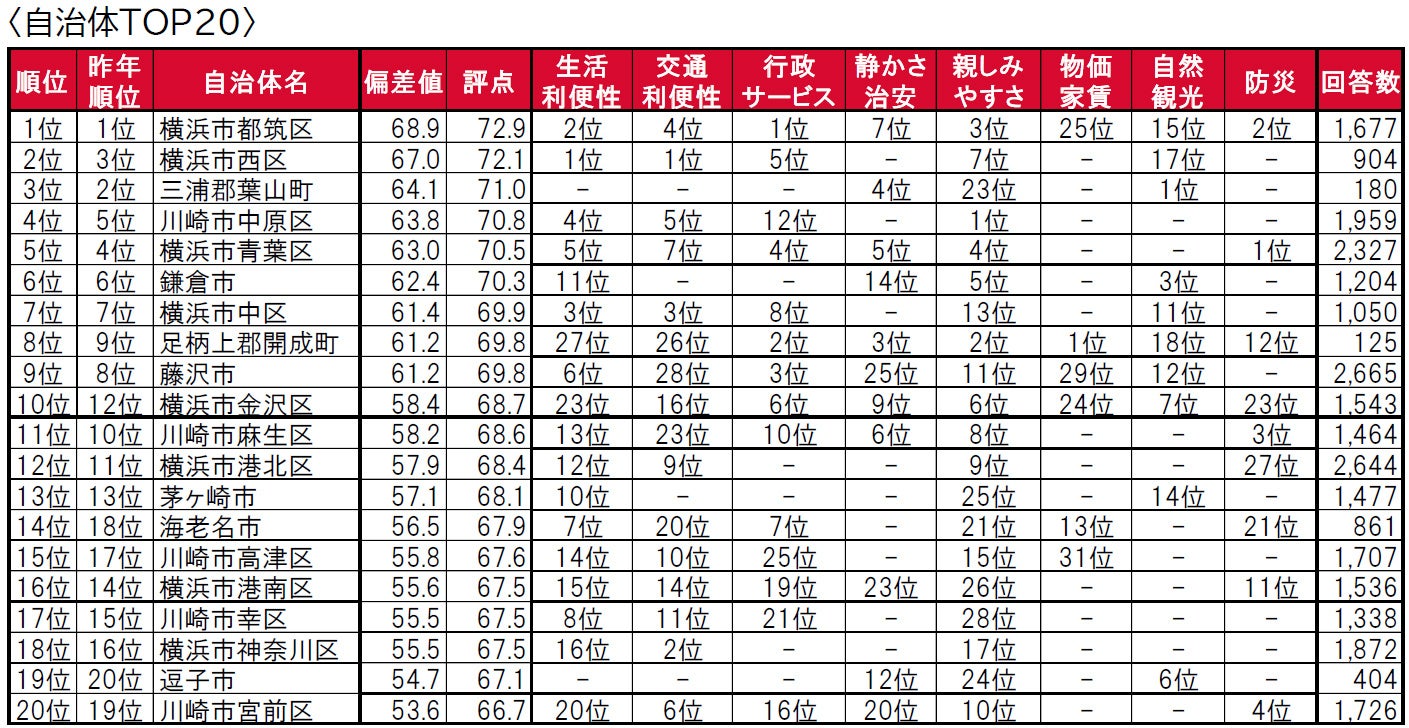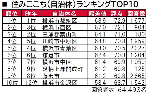 1位は、5年連続で横浜市都筑区です。2位は、昨年3位の横浜市西区、3位は、昨年2位の三浦郡葉山町です。トップ10では、10位に横浜市金沢区(昨年12位)がランクインしていますが、それ以外の自治体は順位の変動はあるものの、昨年と顔ぶれは同じという結果になっています。