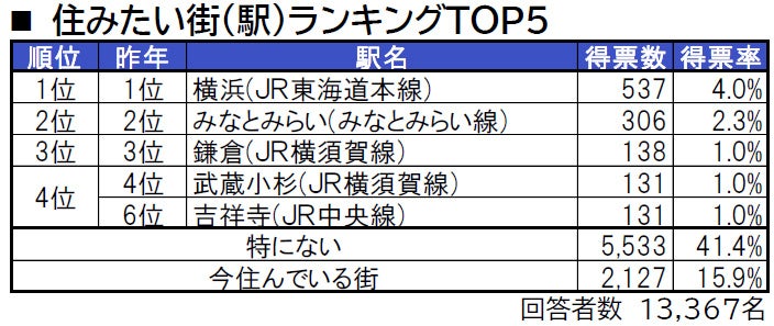 トップ3は4年連続で、1位横浜(JR東海道本線)、2位みなとみらい(みなとみらい線)、3位鎌倉(JR横須賀線)です。4位は、2年連続で武蔵小杉(JR横須賀線)と、同率タイで吉祥寺(JR中央線)がランクインしています。