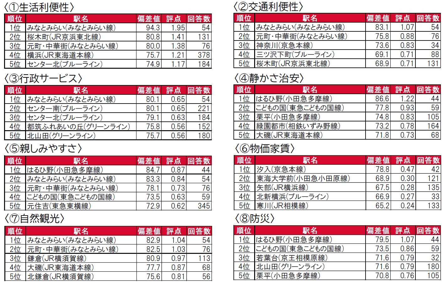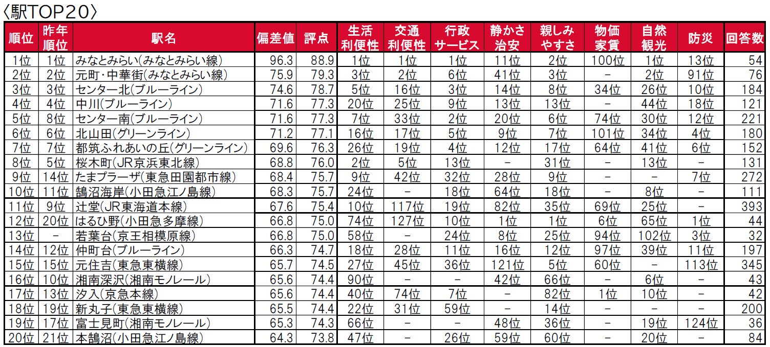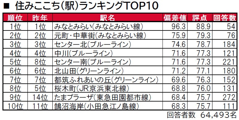 トップ3は3年連続で、1位みなとみらい(みなとみらい線)、2位元町・中華街(みなとみらい線)、3位センター北(ブルーライン)です。1位のみなとみらい(みなとみらい線)は、唯一偏差値90台の極めて高い評価を得ています。横浜市営地下鉄のブルーライン(センター北・中川・センター南)とグリーライン(北山田・都筑ふれあいの丘)沿線の駅が3位~7位とトップ10の半数を占める結果となっています。