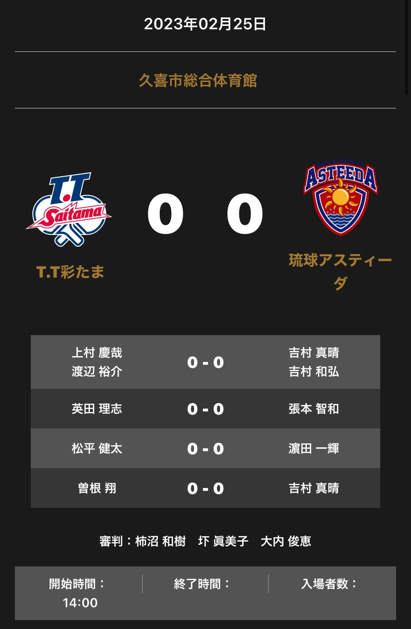 ノジマTリーグ 2022-2023シーズン 公式戦 2月25日開催 T.T彩たま vs 琉球アスティーダ対戦オーダー発表