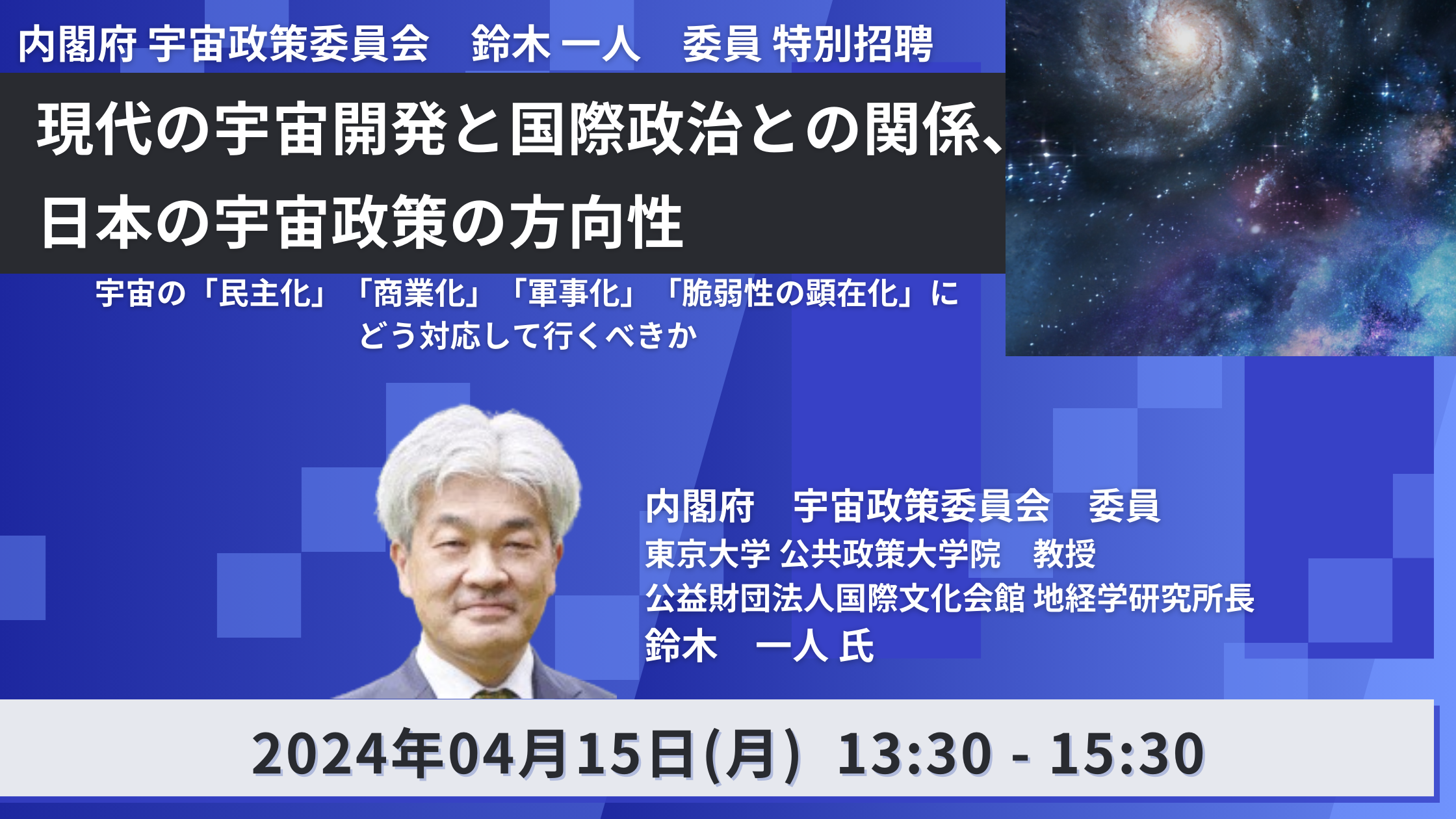 【JPIセミナー】内閣府 宇宙政策委員会 鈴木 一人 委員 特別招聘「現代の宇宙開発と国際政治との関係、日本の宇宙政策の方向性」4月15日(月)開催