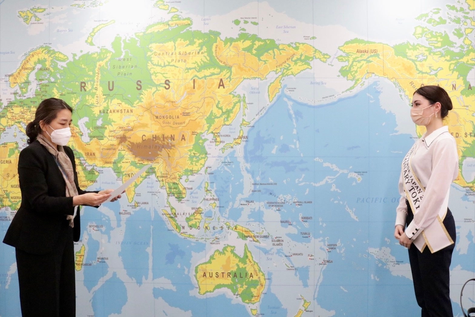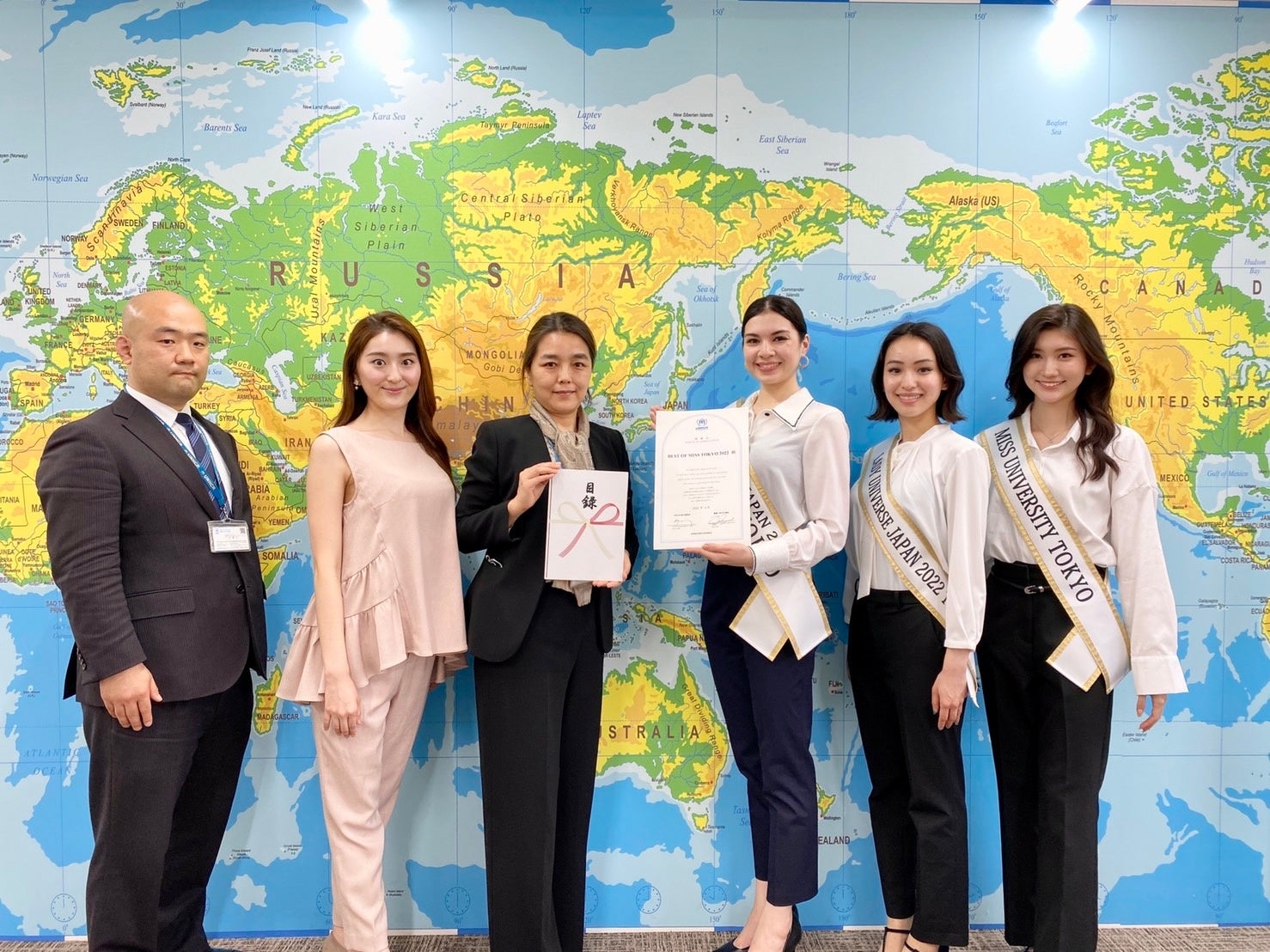 ファイナリストを代表して、ミスユニバースジャパンプレリミナリー2022東京 富士伶奈(ふじ・れいな)、レディーユニバースジャパン2022東京 岩本梨伽(いわもと・りか)、ミスユニバーシティ2022東京 鬼束もも(おにつか・もも)、ベストオブミス東京大会ファイナリスト池田実央(いけだ・みお)の4名が、国連UNHCR協会を訪問し、感謝状を受けとった。