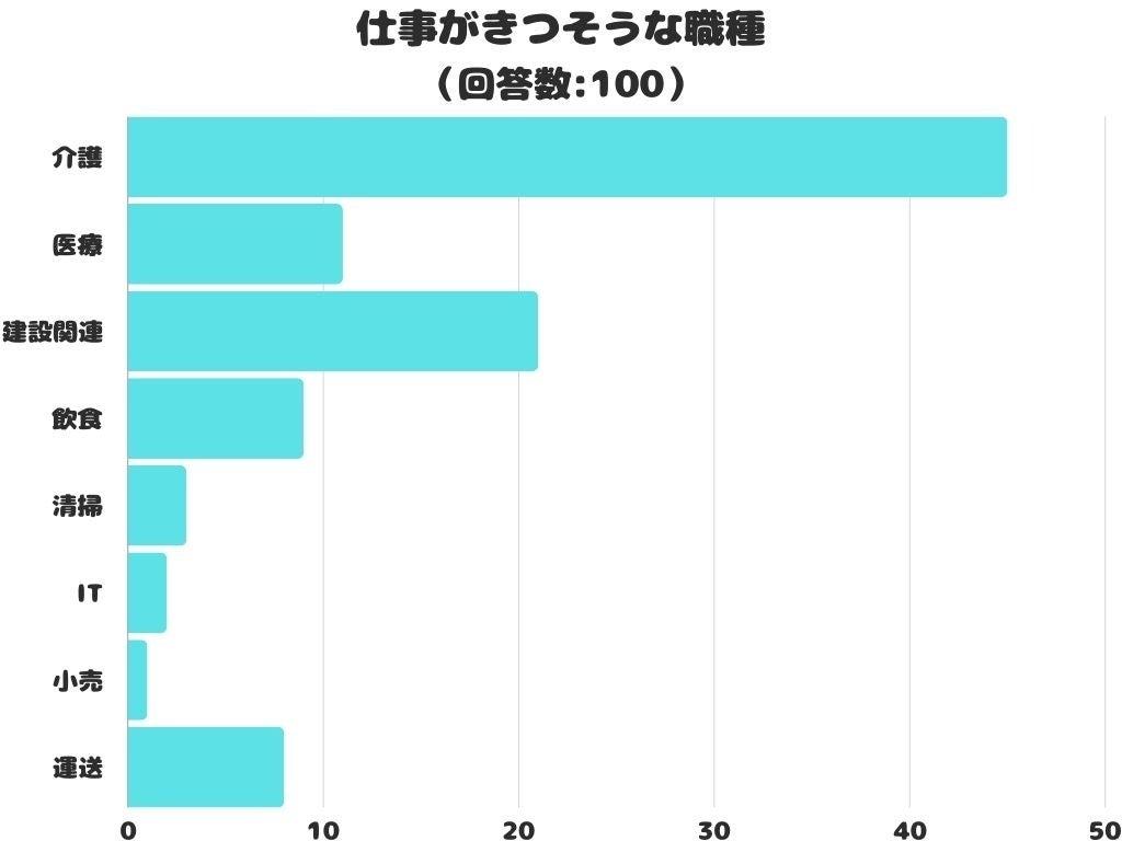 仕事がきつそうな職種をアンケートにて調査したところ、1位は「介護」でした。