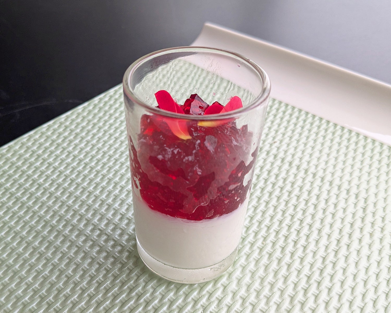 酸味の効いた赤いローズヒップティーゼリーは下のパンナコッタとの相性抜群です。ぜひ一緒にお召し上がりください。