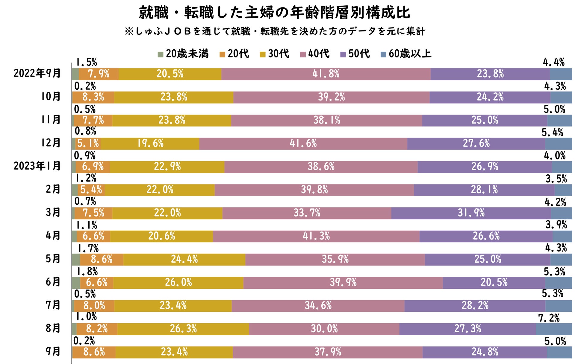 9月は夏休み期間が明け、子育て層の就職活動が活発になる傾向があるため、平均年齢は下降しやすい。実際に、年齢階層別構成比でみると、子育て層が多いと思われる30~40代の比率が、前月から5ポイント増加した。