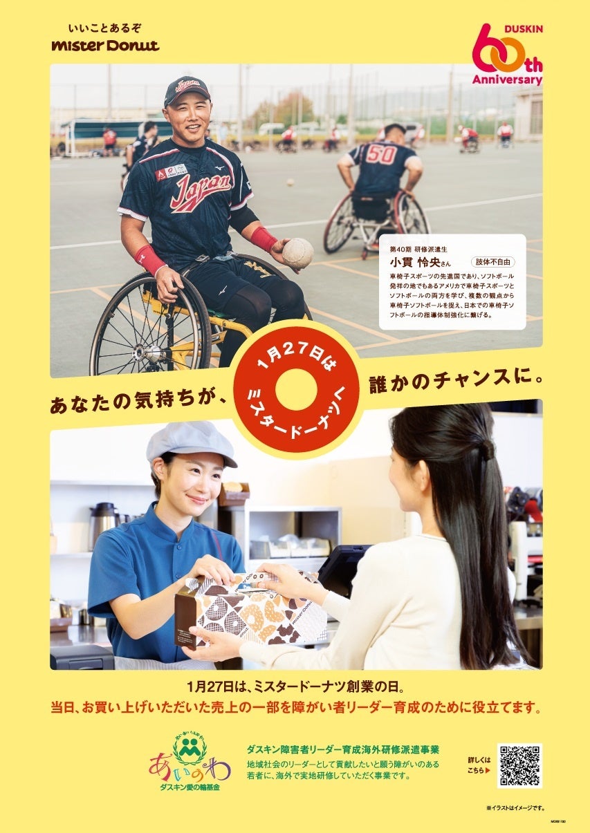 1月27日にミスタードーナツ店舗でお買い上げいただいた売上の一部を障がいのある方の自立と社会参加を支援する「公益財団法人 ダスキン愛の輪基金」に寄付させていただきます。当日はショップでドーナツをお楽しみいただき、社会貢献活動への参加をしてみませんか。