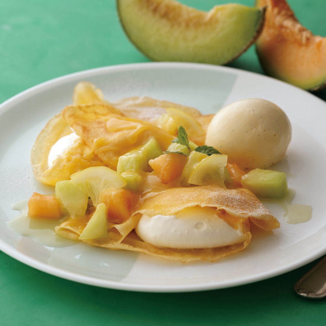焦がしバターを加えてこんがりと焼いた自家製クレープに、クレーム・シャンティを包みました。メロン、レモンクリーム、バニラアイスを合わせた、初夏のクレープ。