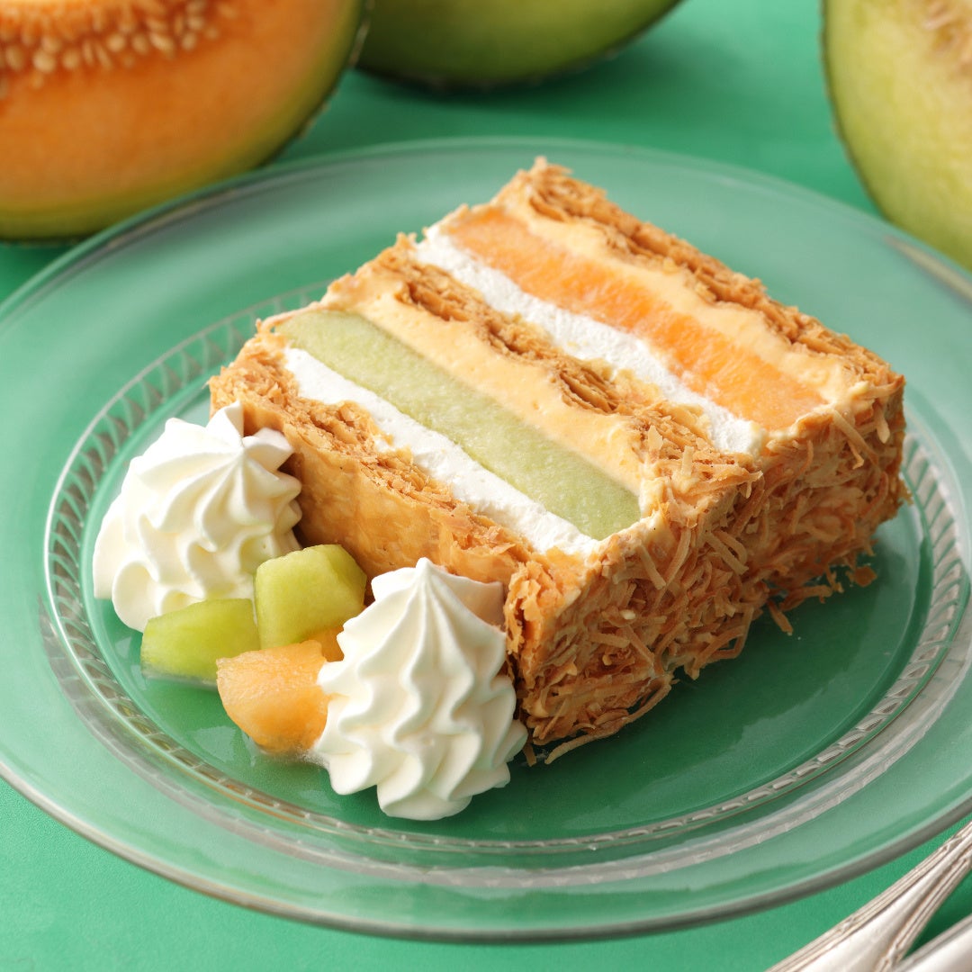 マイルドで上品な甘みと果肉感のある“赤肉メロン”と、とろける甘みが際立つ芳醇な香りの“青肉メロン”。2種類のメロンをサクサクパイ生地で贅沢に味わう一品。