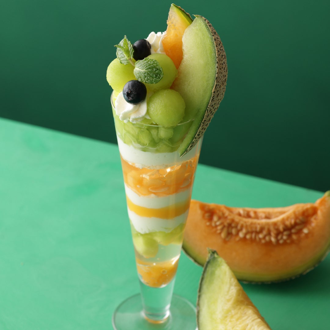 フェアの中心は、みずみずしいメロンの果肉や透明感のあるジュレを重ねた「ダブルメロンパフェ」が登場します。メロン果肉の間には、なめらかなマスカルポーネクリームや大人の味わいの白ワインジュレなどを加え、バニラアイスをあわせました。