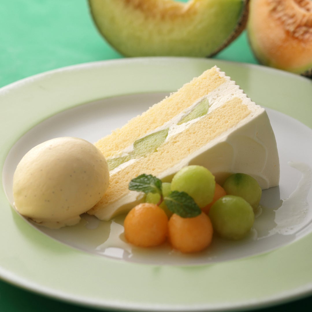 旬を迎えたメロンを、生クリームとスポンジでサンドした初夏のショートケーキ。バニラアイスを添えて。