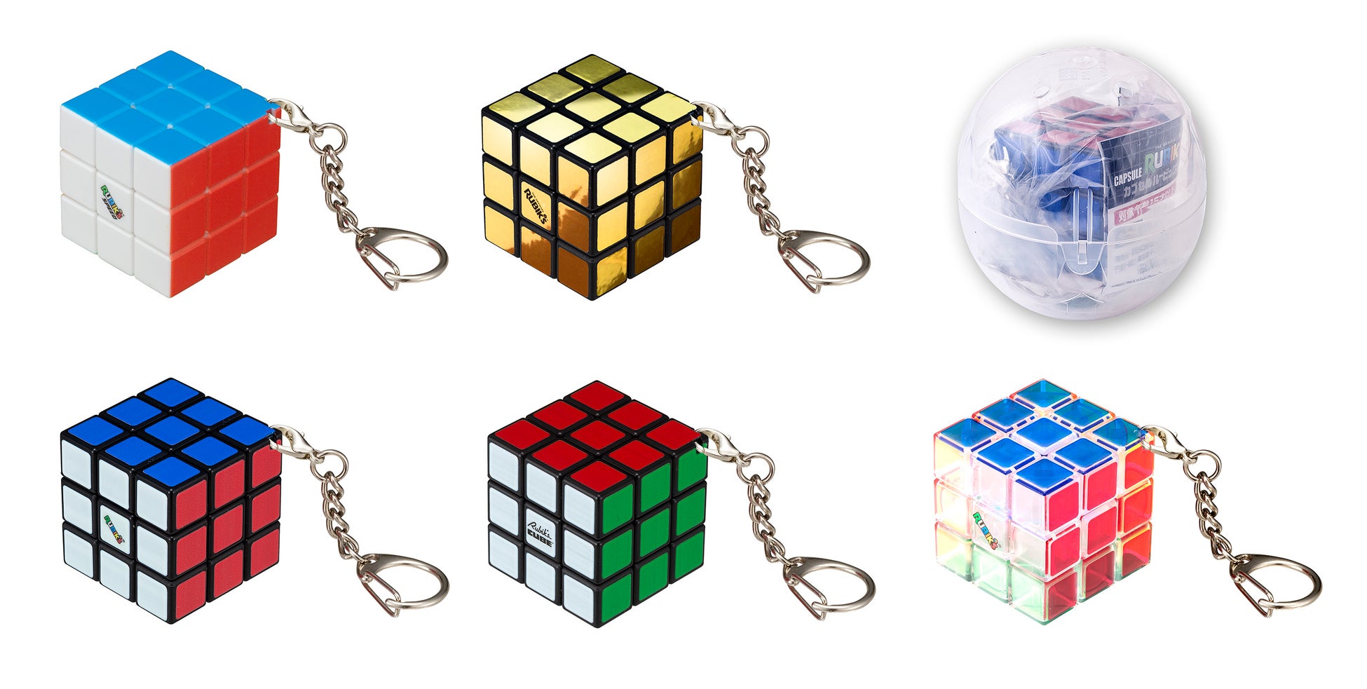 『カプセル ルービックキューブ』は、各面一辺約34.3mmのミニサイズながら、通常のルービックキューブ同様に回して揃えるパズルです。さらに、キーチェーン付きでバッグやポーチにつけて持ち歩けるアクセサリーとしても楽しめます。ラインアップは、「ルービックキューブ3×3」「1980年オリジナルルービックキューブ」「ルービックキューブクリスタル」「SPEEDカラー」「ゴールドカラー」の全5種。これまでに発売した3×3タイプのルービックキューブシリーズの中から代表的なラインアップをミニサイズにし、懐かしさと新しさが詰まったコレクションしたくなるアイテムです。