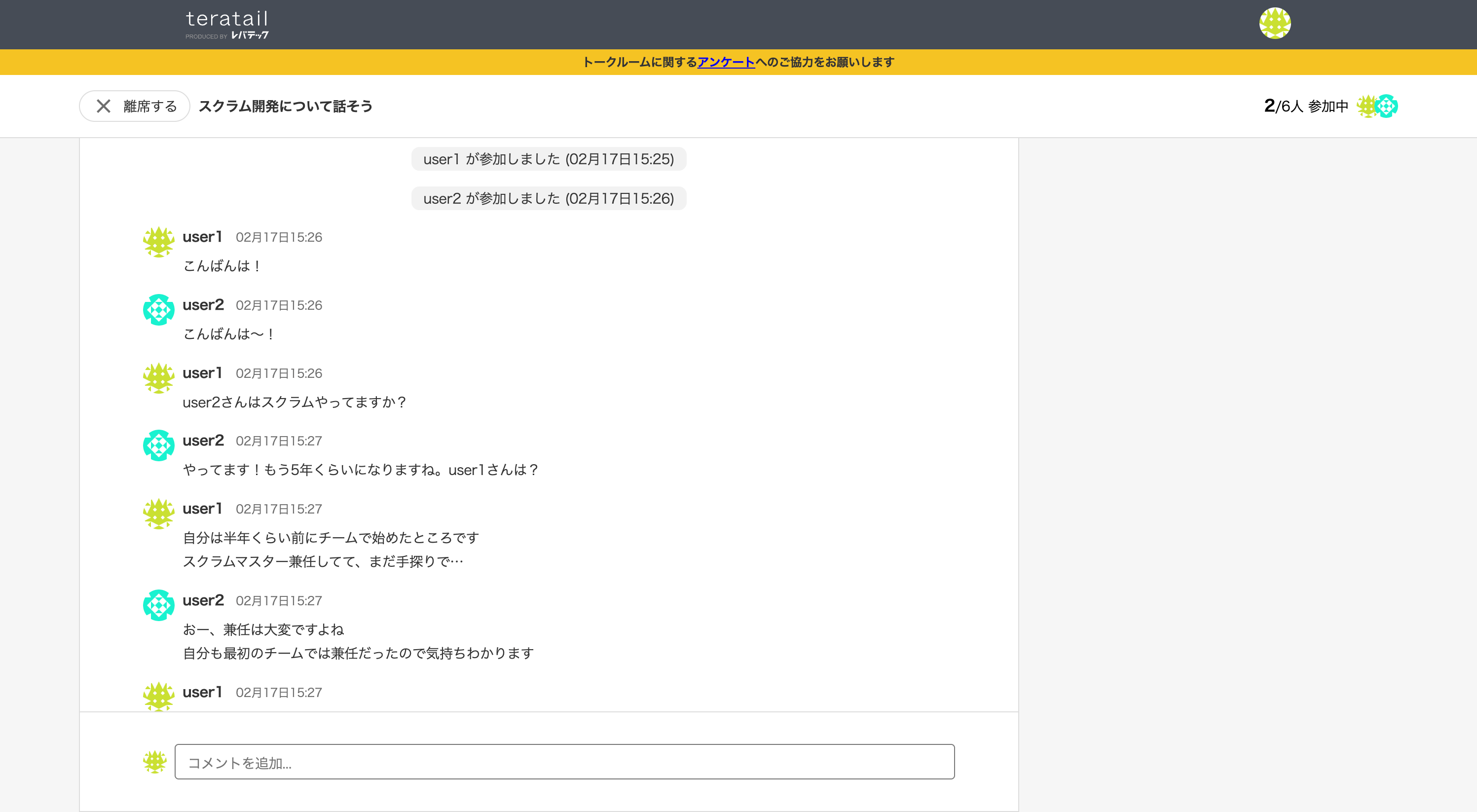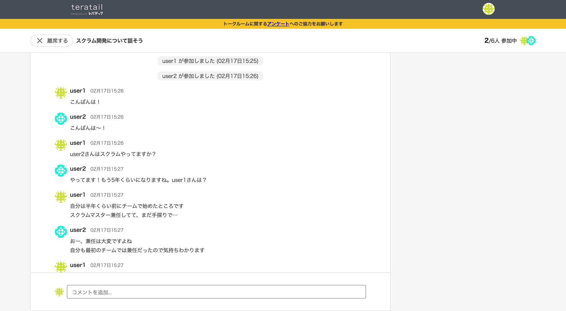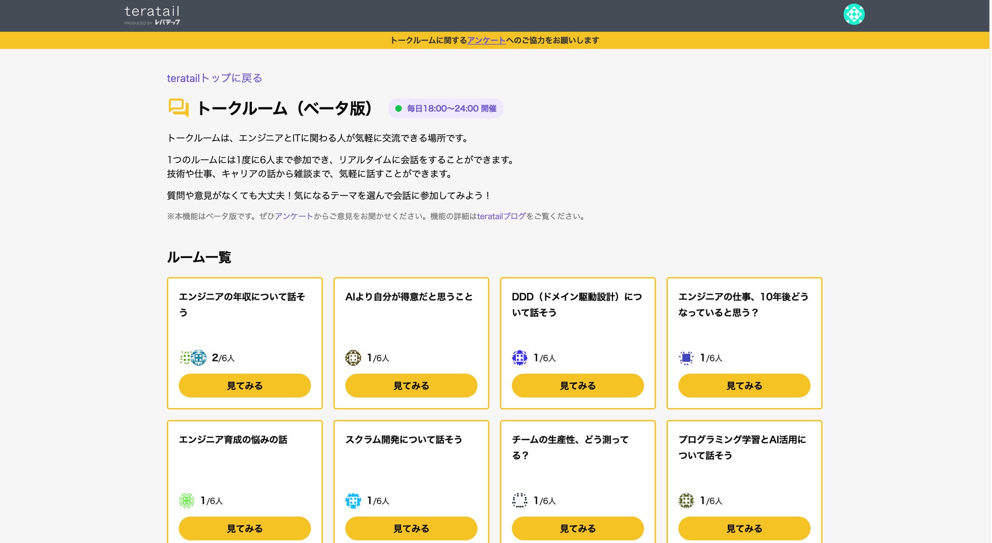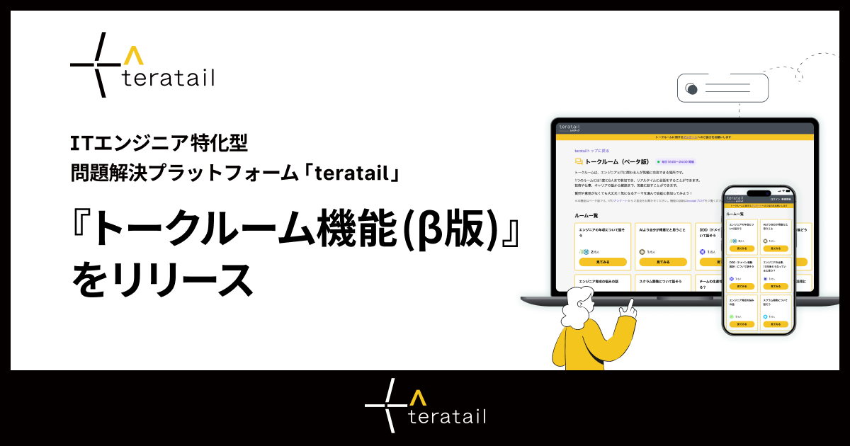 teratailは「トークルーム」を通じて、エンジニア同士が気軽に交流できる場を提供することで、価値ある知識を引き出し合う場をさらに拡大してまいります。今後もユーザーの皆様からのフィードバックをもとに機能改善を重ね、より価値のあるコミュニティへと発展させてまいります。