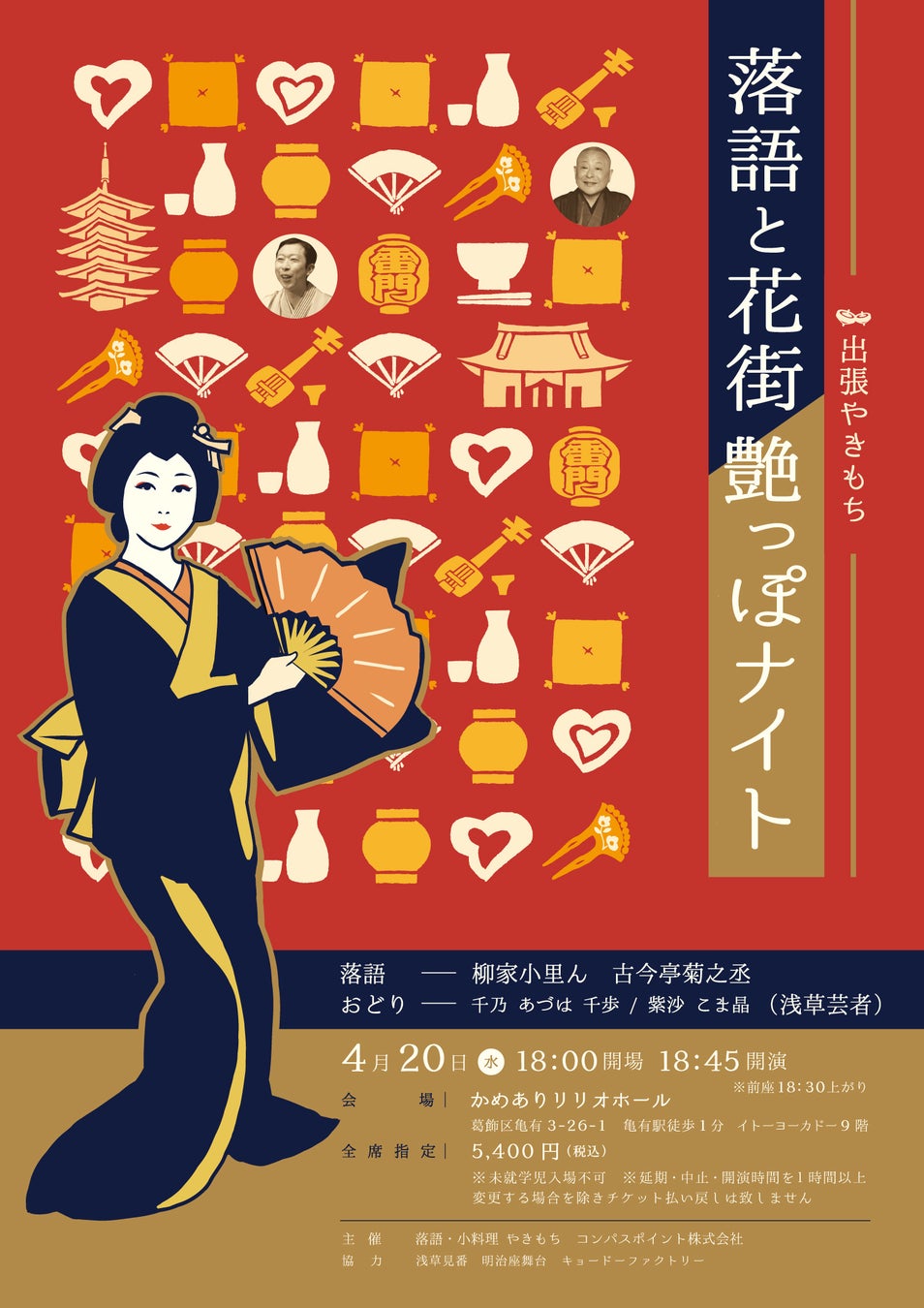 柳家小里ん・古今亭菊之丞と、現役の浅草で活躍する芸者たちによる、楽しくちょっと色っぽい「艶(つや)っぽ」な夜 『出張やきもち 落語と花街 艶っぽナイト』4/20開催!カンフェティにてチケット発売中