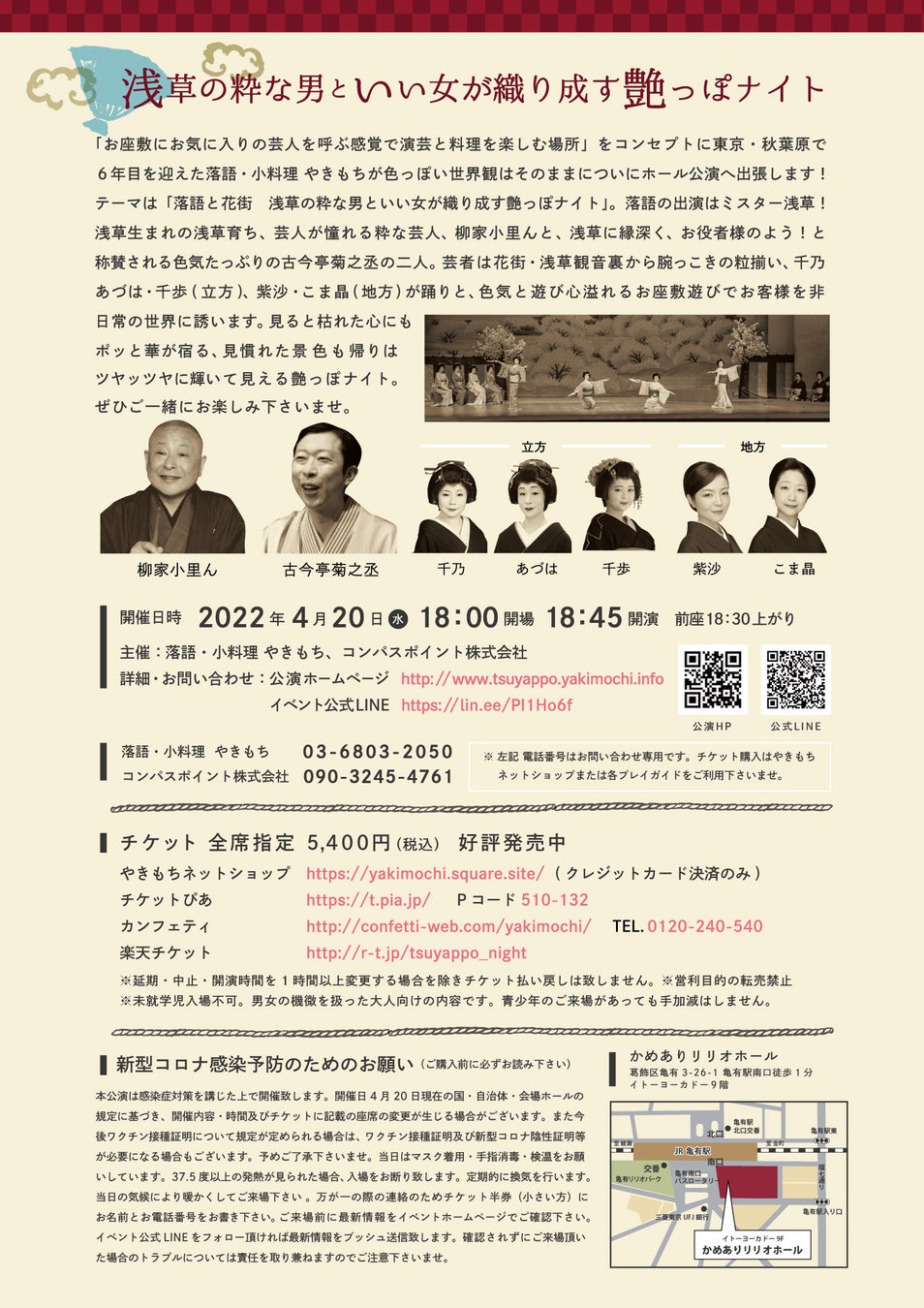 『出張やきもち 落語と花街 艶っぽナイト』が2022年4月20日(水)にかめありリリオホール(東京都葛飾区)にて上演されます。チケットはカンフェティ(運営:ロングランプランニング株式会社、東京都新宿区、代表取締役:榑松 ⼤剛)にて発売中です。