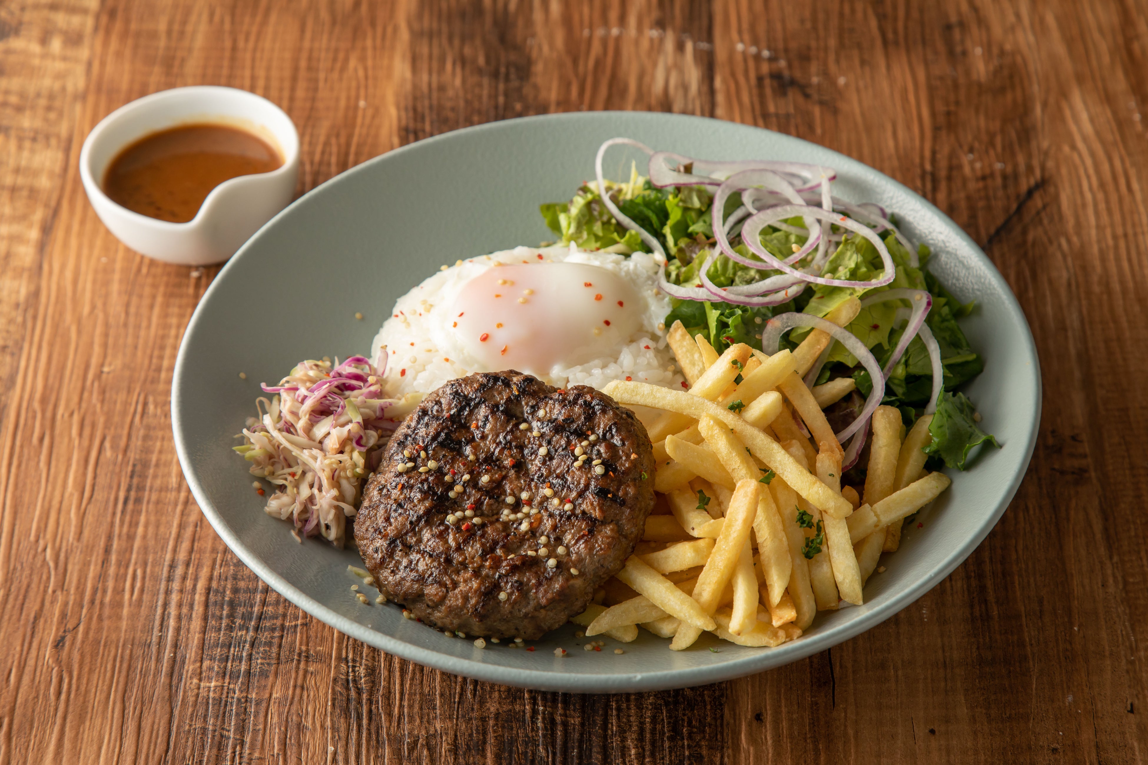 だし巻きベーコンバーガー パワーサラダ ロコモコディッシュ 週替わりチキンプレート