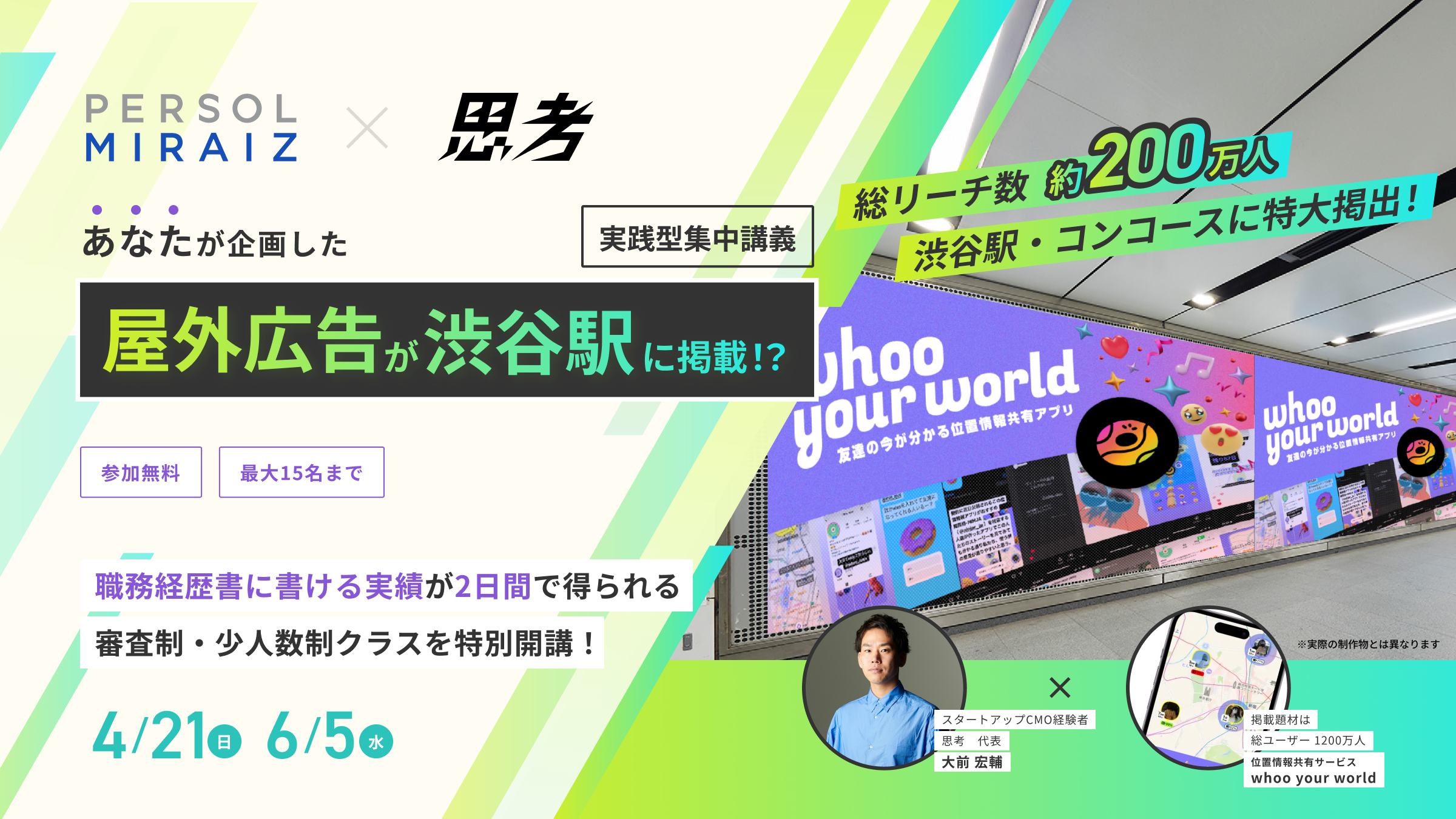 【DAY1:4/21(日)・DAY2:6/5(水)開講】個人向けリスキリングサービス「PERSOL MIRAIZ」が元YOUTRUST CMO大前氏による実践マーケティング講座を開催