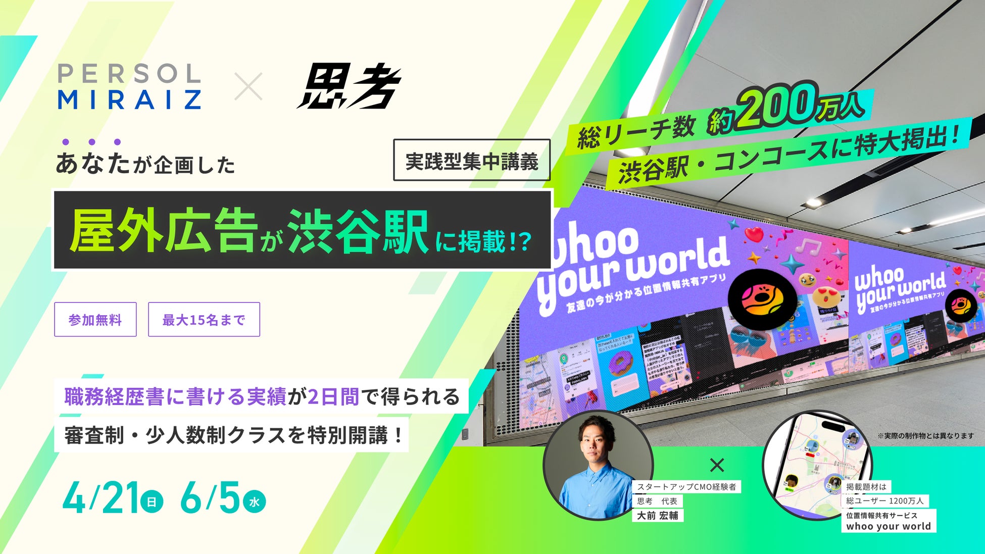 元株式会社YOUTRUST CMOで、現在思考合同会社の大前 宏輔氏を招き、実際の広告宣伝費約200万円を使って位置情報共有サービス「whoo your world」の屋外広告を設計する2日間の集中講座です。1日目となる2024年4月21日(日)には参加者が実際に街を歩くフィールドワークで屋外広告の事例を分析し、その後実際の屋外広告案を作成する企画ワークを行います。その後、2日目となる6月5日(水)には、1日目で考えた結果の振り返りを行います。