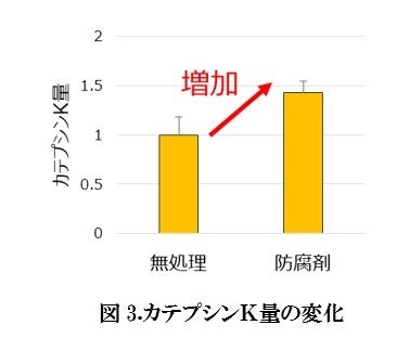 カテプシンKの増加は、エラスチン線維構造の変化を引き起こし、エラスチン線維の「質」の低下に導く可能性があります。そこで、培養線維芽細胞に化粧品で一般的に配合される防腐剤のメチルパラベンを添加し、カテプシンKの量的変化を確認しました。その結果、防腐剤処理によりカテプシンKの量が増加することを確認しました(図3)。
