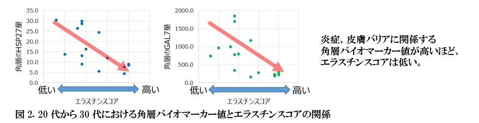 そこで、同年代でもエラスチン線維構造が異なる理由を検証すべく、撮影部位から角層を採取し、当社独自の肌解析方法「角層バイオマーカー」で測定しました。肌の敏感性を表す「刺激感受性タンパク質(HSP27)」および、バリア機能に関わる「細胞乾燥タンパク質(GAL7)」の両タンパク質量をエラスチンスコアと比較した結果、特に20代から30代の若齢層で、これら二つの角層バイオマーカー値が高いことが分かりました。HSP27が高いほど敏感性も高く、GAL7が高いほどバリア機能が低下している状態です。さらに両角層バイオマーカー値が高いほど、エラスチンスコアは低いことも分かりました(図2)。
