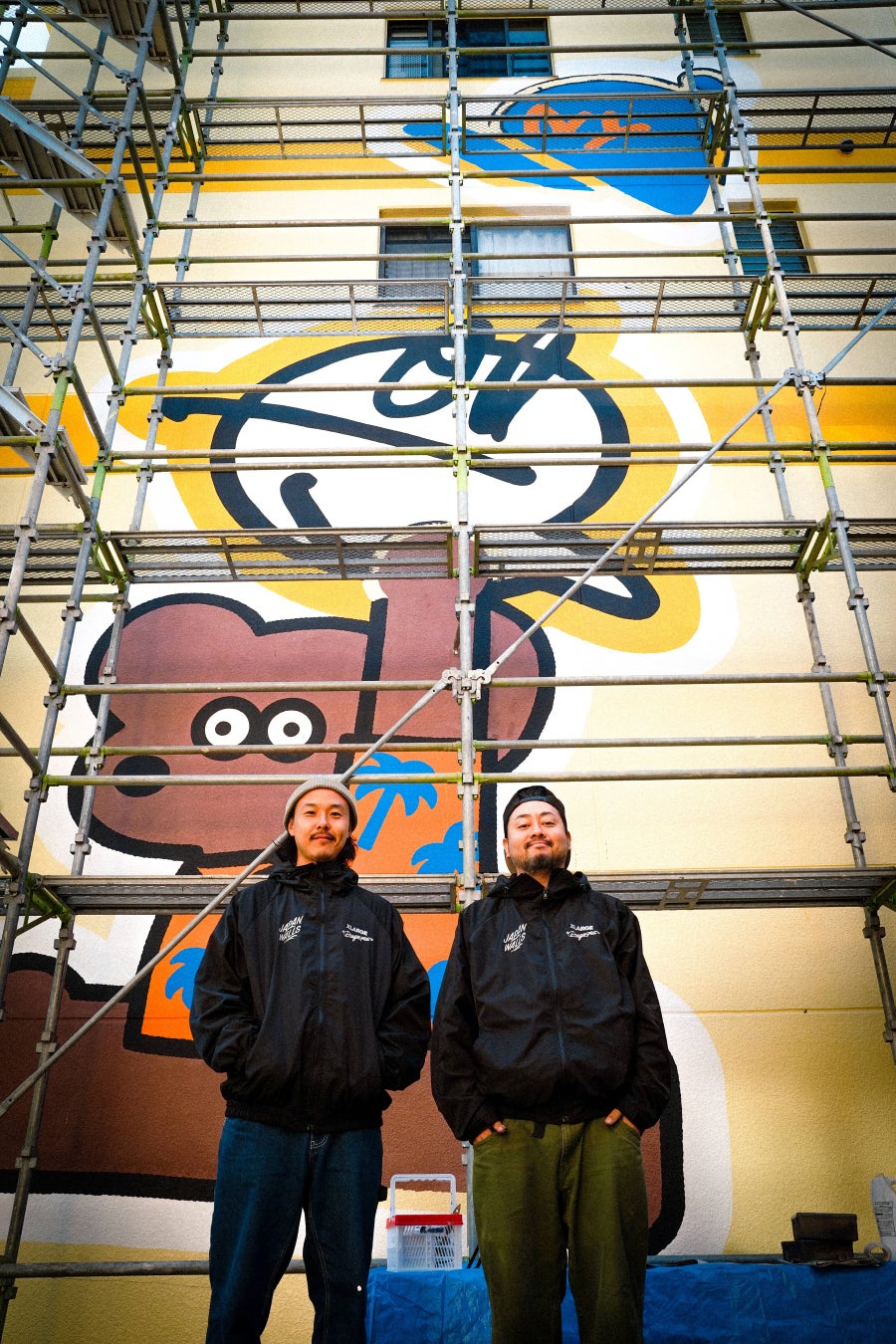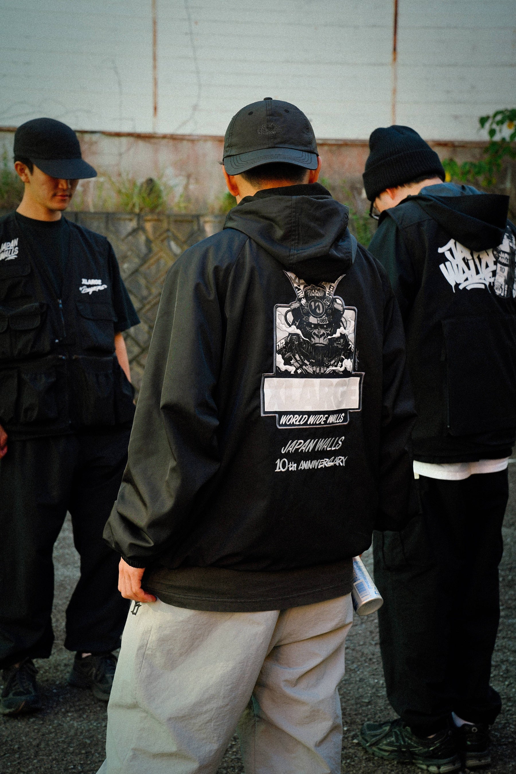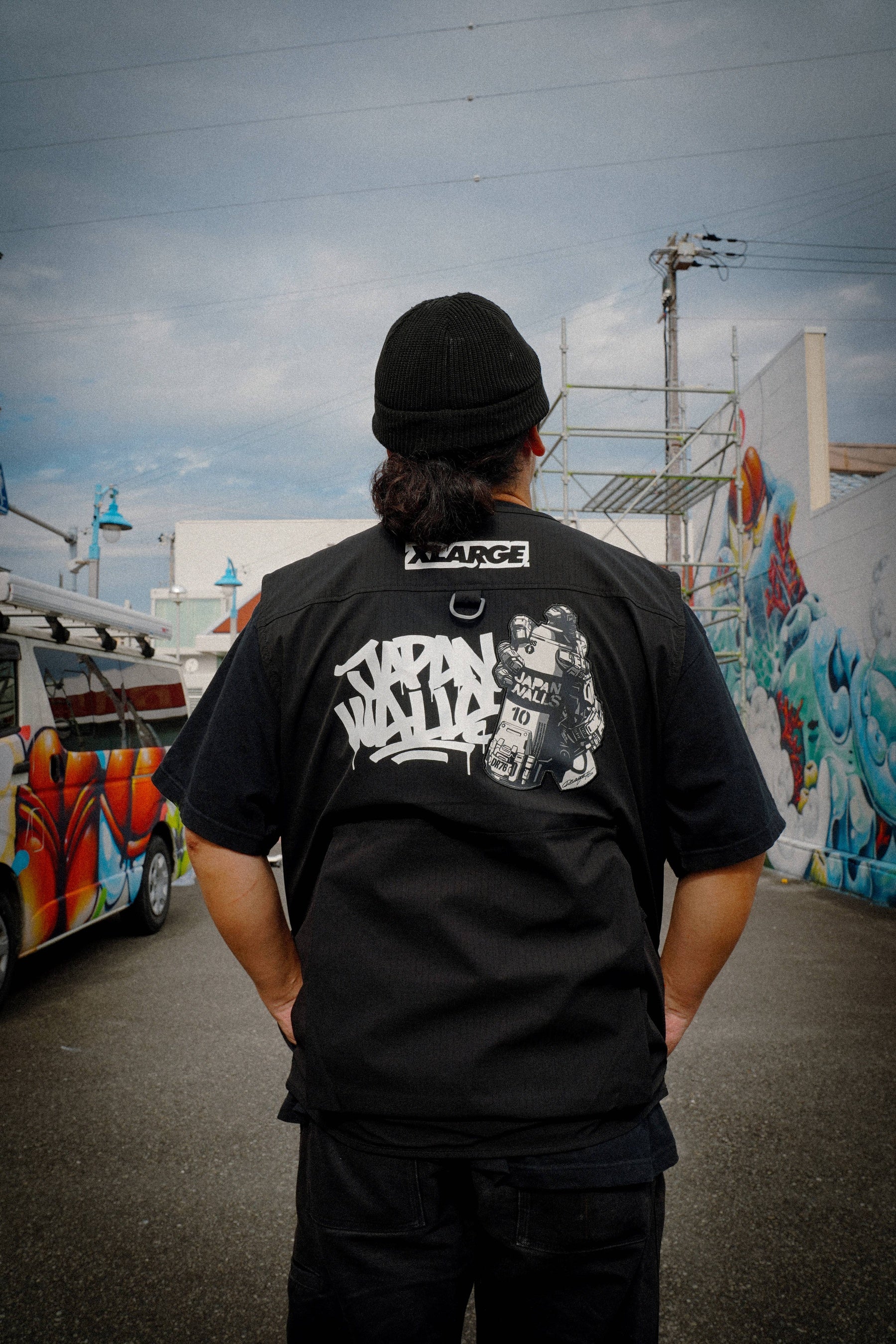 2025年は、「JAPAN WALLS」創立10周年、ワイキキビーチと白良浜の姉妹浜提携25周年、白浜開催5周年が重なる特別な年です。この節目を記念して、XLARGEはDRAGON76を迎え、JAPAN WALLSとのトリプルコラボレーションアイテムを制作・販売いたしました。アーティストのための実用的なアイテムとして、スプレー缶の収納ポケットを備えたベストとジャケット、Tシャツをイベントユニフォームとして提供し、ミューラル制作の活動サポートを行いました。イベントの様子を収めた写真をご紹介します。