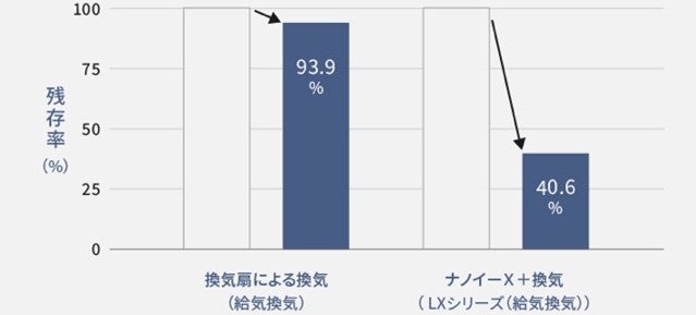 一般的な「換気扇による給気換気」と、エオリアLXシリーズによる「ナノイーX+換気」を比較すると、花粉の残存率が40%まで低減!