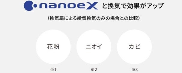 また、冷暖房や換気をしながら同時にナノイーXを放出するため、花粉※1はもちろん、ニオイ※2やカビ菌※3などにも抑制効果を発揮します。