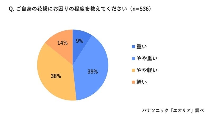 また、ご自身の花粉にお悩みの程度については「重い」(9%)・「やや重い」(39%)と回答した方が48%、「軽い」(14%)・「やや軽い」(38%)と回答した方が52%と二分する形となりました。