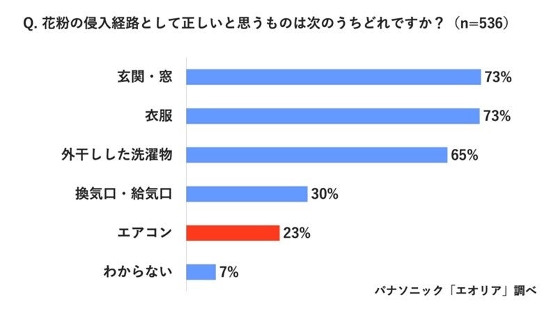 今回、花粉の室内への侵入経路について、その理解度を調査し誤解があることがわかりました。「花粉の侵入経路として正しいと思うものは次のうちどれですか?」という質問では、「玄関・窓」、「衣服」、「外干しした洗濯物」、「換気口・給気口」が正しい選択肢ですが、23%が「エアコン」と回答。「お部屋の空気を吸い込んで、暖めたり冷やしたりし、再び室内に吹き出す」というのがエアコンの基本機能であり、一般的にはエアコンから花粉が侵入することはありません。また、「わからない」と回答した方も7%と、10年以上花粉に悩まされている方が6割を超える回答者の中でも、多くの方が花粉の室内への侵入経路を正しく理解していないことが明らかになりました。