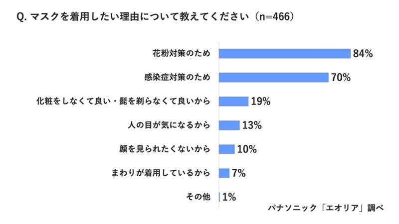 花粉時期の外出時のマスク着用については、「必ず着用したい」(52%)、「時と場合によって着用したい」(35%)と、花粉にお悩みの方においては高い着用意向が見られました。一方、その理由については「花粉対策のため」(84%)の他にも、「感染症対策のため」(70%)が多く、続いて「化粧をしなくて良い・髭を剃らなくて良いから」(19%)、「人の目が気になるから」(13%)、「顔を見られたくないから」(10%)、「まわりが着用しているから」(7%)と、花粉対策以外の理由でマスクを着用したいと考えている方も多くいることがわかりました。