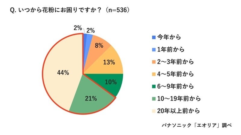 まずは、花粉にお悩みの期間についてたずねたところ「20年以上前から」が最多で44%、続いて「10年〜19年前から」が21%と、10年以上花粉に悩まされている方が65%という結果になりました。