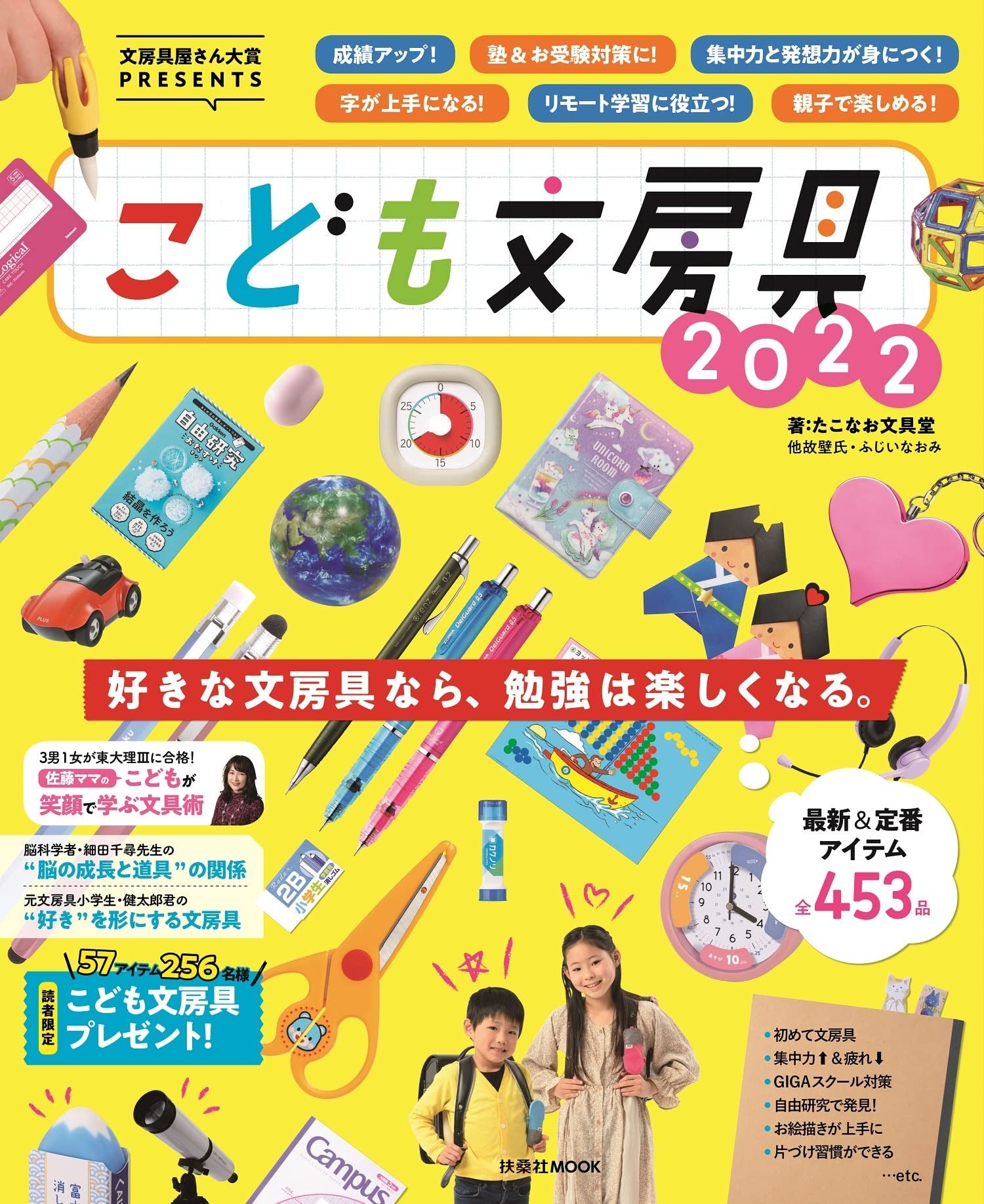 本書では、「こども文房具」の専門家として、子どもたちの成長に最適な文房具を発信しているたこなお文具堂(他故壁氏・ふじいなおみ)が、子育て中の親御さんにおすすめしたい「はじめての文房具」を全453点紹介しています。