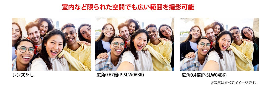 広角レンズは、0.67倍と0.4倍の2種類をご用意。せまい室内や限られたスペースでも、大人数でのグループ写真や広がりのある室内写真を簡単に撮影することができます。どちらも画像周囲が暗くなる「ケラレ」を軽減するマルチレンズ構造を採用するほか、0.4倍モデルは前面レンズを外すことでマクロ撮影にも対応します。