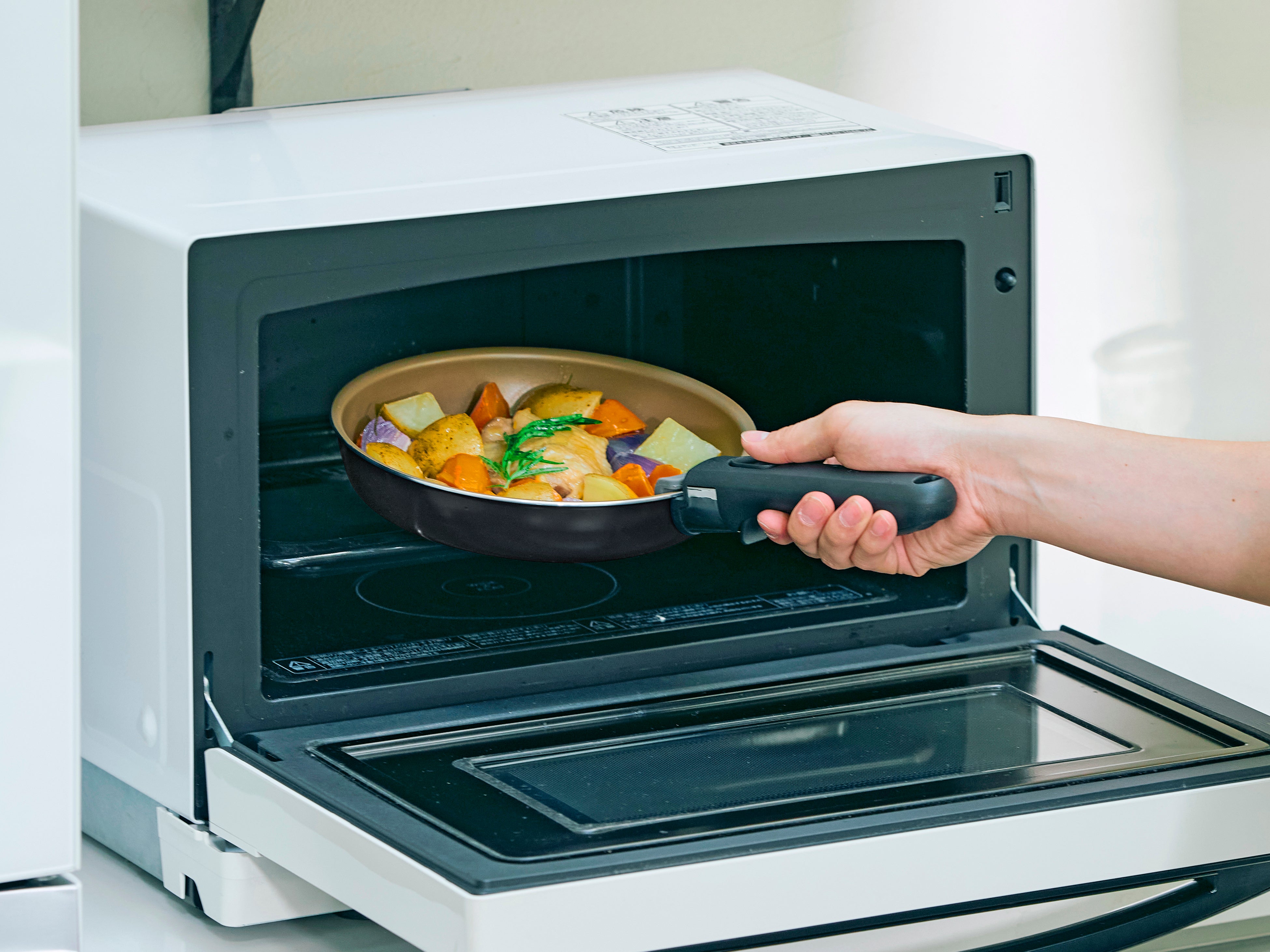 専用ハンドルを外せばオーブン調理ができます。コンロで食材を炒めてからそのままオーブンへ入れることができるので、余計な洗い物が増えません。