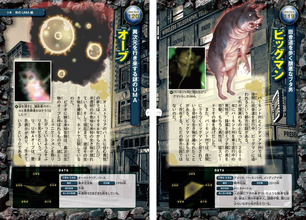 生息地や目撃された年。出現したときのエピソードなどを細かく記載。これ一冊でUMAのすべてが分かる造りになっています。