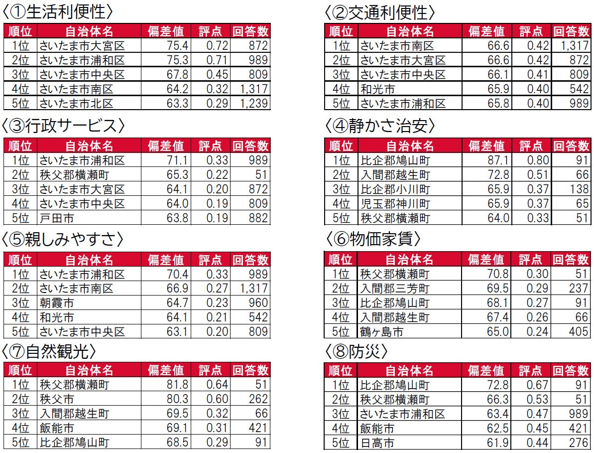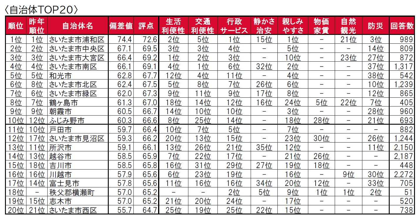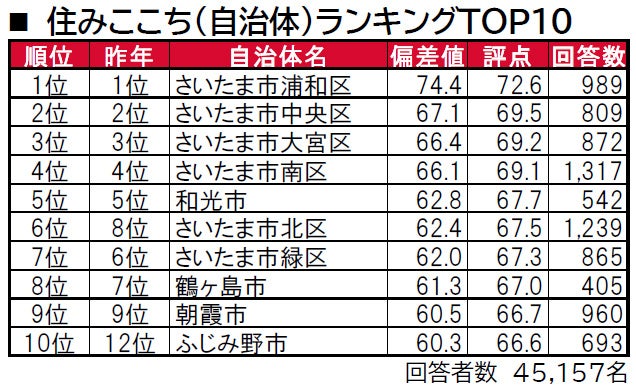 1位は、5年連続でさいたま市浦和区、2位も5年連続でさいたま市中央区です。3位は、3年連続でさいたま市大宮区です。4位のさいたま市南区、5位の和光市も3年連続となっています。トップ10内では、10位にふじみ野市(昨年12位)が昨年から順位を上げてランクインしています。