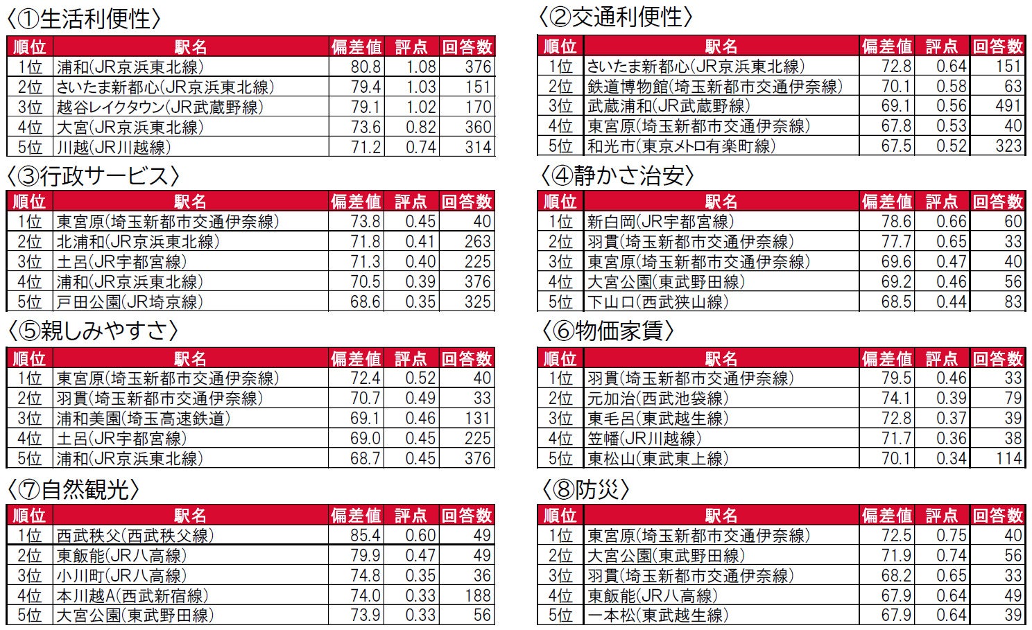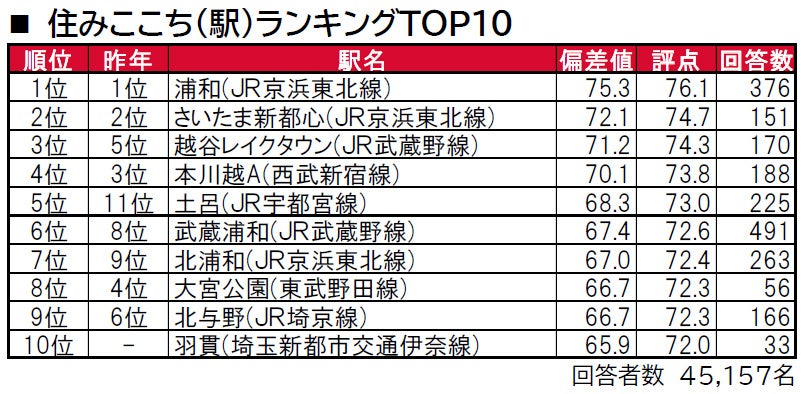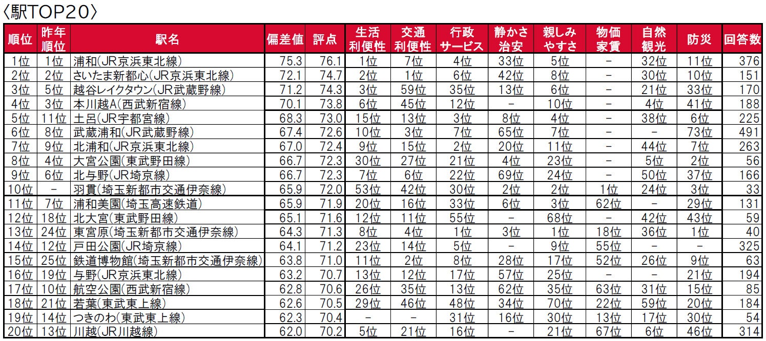 1位は3年連続で、浦和(JR京浜東北線)です。2位は3年連続でさいたま新都心(JR京浜東北線)です。3位は越谷レイクタウン(JR武蔵野線)です。トップ10内では、5位に土呂(JR宇都宮線)(昨年11位)、10位に昨年は累計回答数が30名未満だったためランキング集計対象外だった羽貫(埼玉新都市交通伊奈線)が新たにランクインしています。