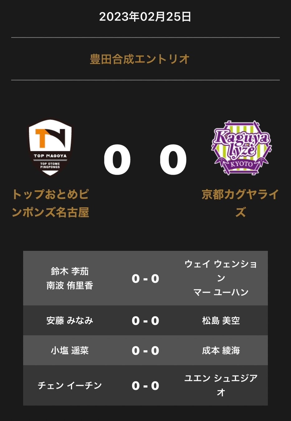 ノジマTリーグ 2022-2023シーズン 公式戦 2月25日開催 トップおとめピンポンズ名古屋 vs 京都カグヤライズ オーダー発表