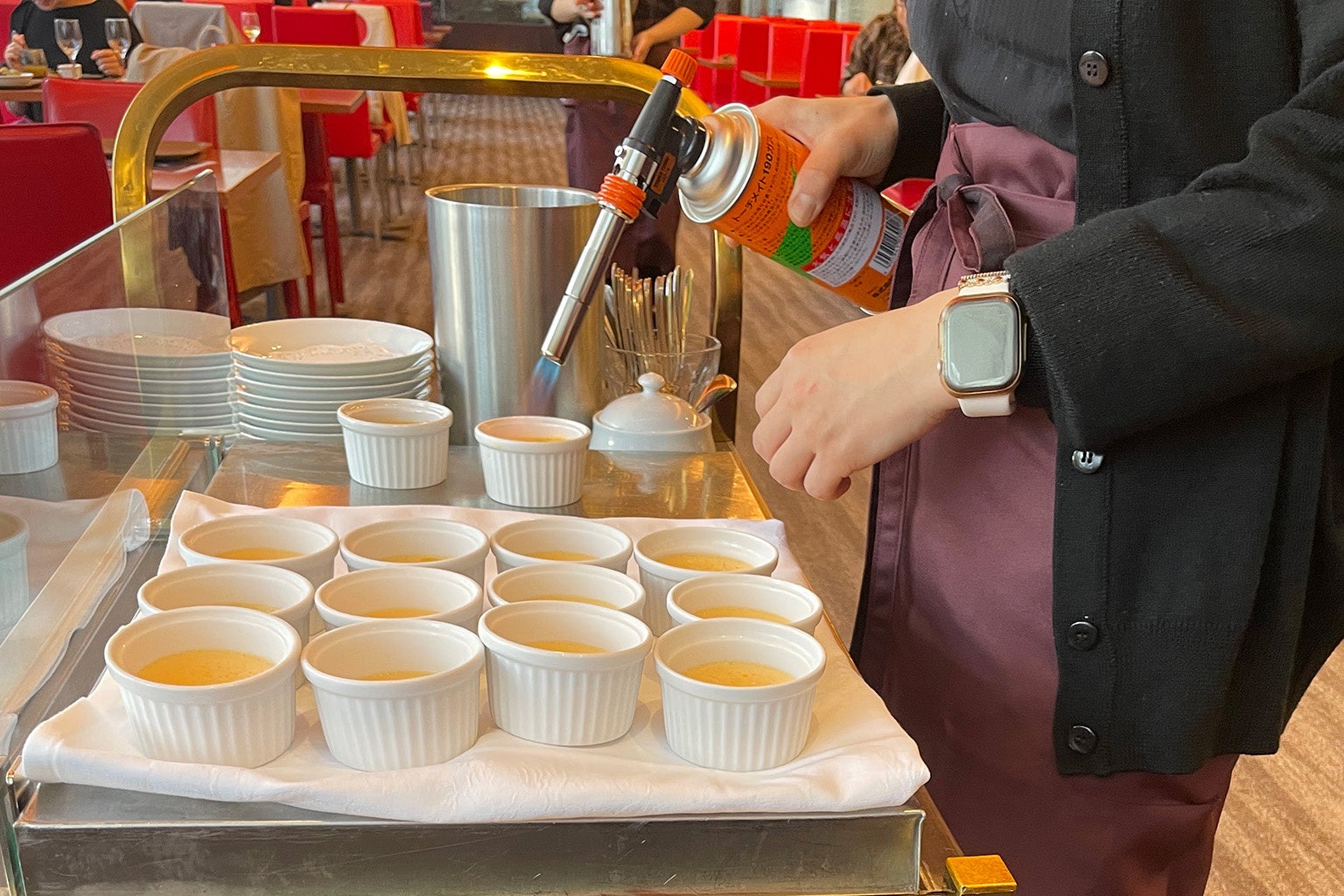 お客様の目の前で表面をバーナーで炙り、香ばしい焼き色を付けて仕上げます。