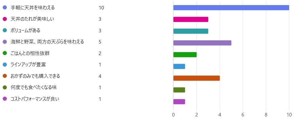 最も多くの票を集めたのは『手軽に天丼を味わえる』というポイントでした。以下2位は『海鮮と野菜、両方の天ぷらを味わえる』、『おかずのみでも購入できる』でした。