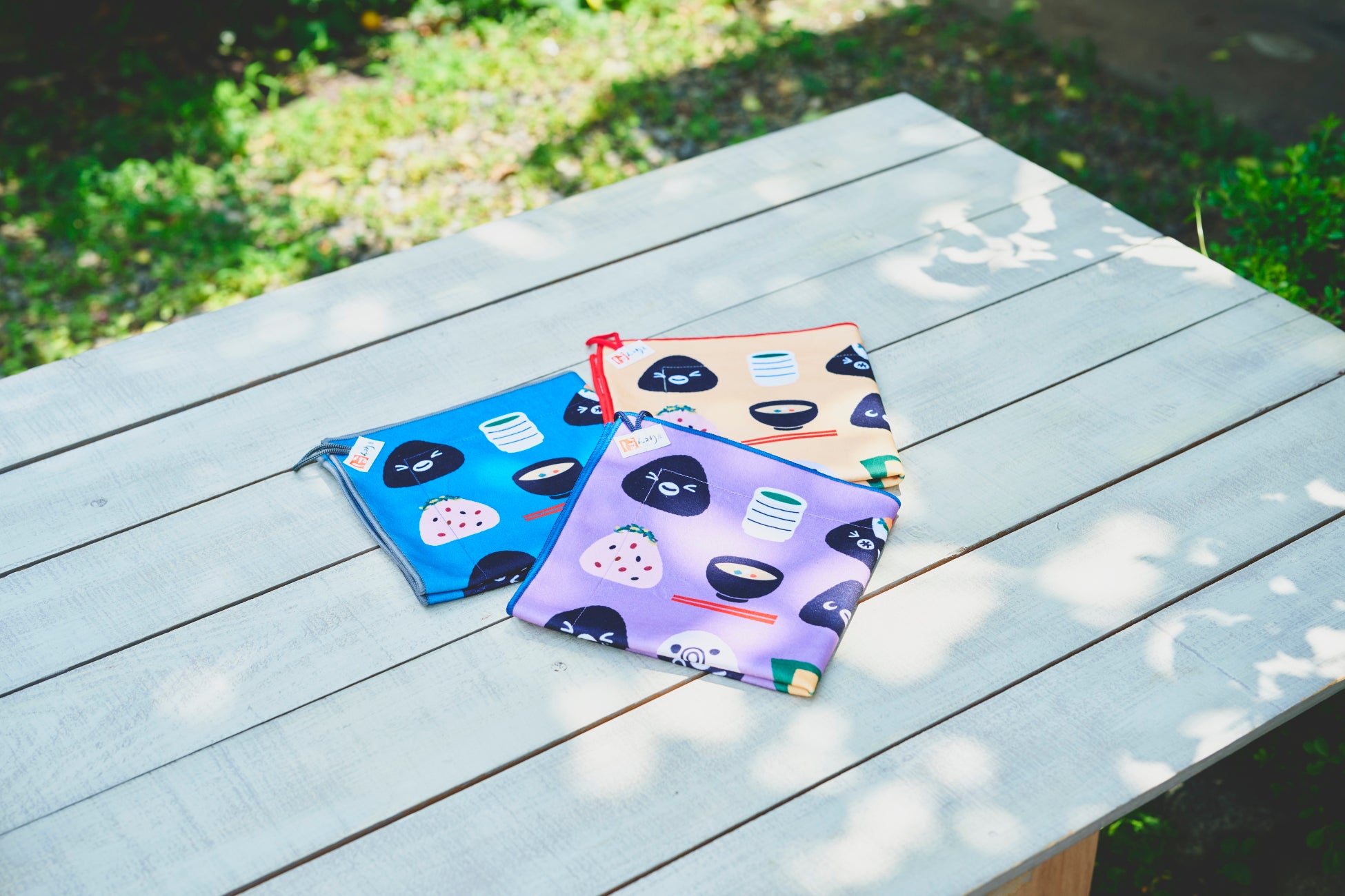 商品概要:オリジナルデザインの「くっつく保冷クロス」におむすび2個と唐揚げ、玉子焼きがついたセット