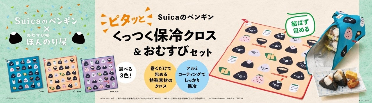 本企画は、毎回ご好評をいただいており、今回で4度目の実施となります。昨年まで販売していた「Suicaのペンギン エコバッグ付きおむすびセット」に続き、今年は新たに「くっつく保冷クロス」をセットにした特別仕様で登場いたします。ほんのり屋のおむすびをイメージした、キュートなデザインの保冷クロスはこれからの季節にぴったりです。