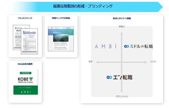 プレスリリースや特設ページ、Web広告での告知に加え、各求人サイトでの集客サポートを実施いたします。『エン転職』『AMBI』『ミドルの転職』とターゲットの異なる3つの求人サイトを活用することで、ターゲットへ網羅的に求人を届けます。